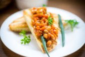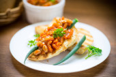 nadziewane mięsem i ryżem z pieczonym sosem pieprzowym na drewnianym stole