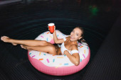 Wysoki kąt widzenia młodych ludzi w opaski party z cios łaskotki pływanie na pierścieniach w basenie w nocy