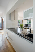 Zdjęcie "Nowoczesne białe meble kuchnia w korytarzu z białą szafą i drewnianą podłogą" może być wykorzystywane do celów osobistych i komercyjnych zgodnie z warunkami zakupionej licencji Royalty-free. Obraz jest dostępny do pobrania w jakości wysokiej rozdzielczości do 5760x3840.