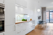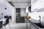 Nowoczesne białe meble kuchnia w korytarzu z białą szafą i drewnianą podłogą