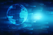 Globalna koncepcja połączenia sieciowego. Wizualizacja dużych zbiorów. Komunikacja społecznościowa w globalnych sieciach komputerowych. Globus z kodami binarnymi, tło technologii internetowej