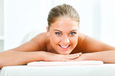 portret uśmiechający się młoda kobieta na stół do masażu