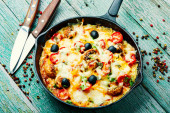 Apetyczna włoska pizza z piersi kurczaka, pomidora, sera i oliwek