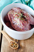 Surowe świeże mięso (wieprzowina) w misce na szarym tle