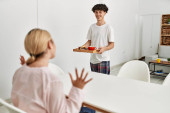 Azji kobieta kostiumy noszenie maski twarzy i rękawiczki otrzymują pudełka żywności, owoców, warzyw i napojów od dostawcy przed domem w czasie izolacji domu.
