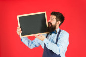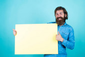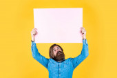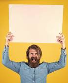 posiedzenie do głosowania. Potrzebuję pomocy. brodaty mężczyzna z łagodnym charakterem. poszukiwany. pusty papier dla twojej informacji. Koncepcja fryzjera. Szczęśliwy hipster z brodą na papierze. puste miejsce do kopiowania