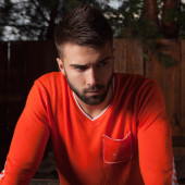 Mężczyzna na czarnym tle zakłada maskę dresu. Nowoczesny wizerunek sportowca z brodą i piękną fryzurą. Pewny siebie wygląd silnego mężczyzny
