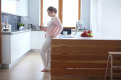 młoda blondynka uśmiecha się stojąc przy stole kuchennym