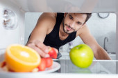 młoda kobieta w białej koszulce i spodenkach biorąca jaja kurczaka z lodówki