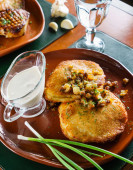 Kotlety ziemniaczane, marynowane pieczarki. lekkie tło w naturalnym świetle.