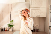 selektywne skupienie radosnej kobiety trzymającej kubek podczas siedzenia na stole kuchennym, nagłówek strony internetowej
