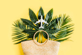 Koncepcja akcesoriów podróżniczych na żółtym tle. Torba rattanowa Eco, model samolotu, okulary przeciwsłoneczne, ananas i liść palmy tropikalnej.
