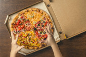 kolaż kobiety trzymającej pizzę w kuchni, koncepcja panoramiczna