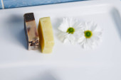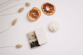 Ręcznie robione naturalne paski mydlane na białym tle. Mydło. copyspace, flat lay, widok z góry