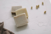 Ręcznie robione naturalne paski mydlane na białym tle. Mydło. copyspace, flat lay, widok z góry