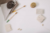 Zero odpadów akcesoria kuchenne, naturalne mydło organiczne. Koncepcja produktów wolnych od tworzyw sztucznych i przyjaznych dla środowiska w gospodarstwach domowych, widok z góry