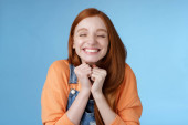 Zdjęcie "Dość zaskoczona emocjonalnie ruda dziewczyna szczęśliwie pozuje przed kamerą nad tłem. Radosne wyrażenie" może być wykorzystywane do celów osobistych i komercyjnych zgodnie z warunkami zakupionej licencji Royalty-free. Obraz jest dostępny do pobrania w jakości wysokiej rozdzielczości do 5760x3840.