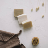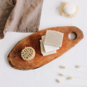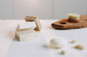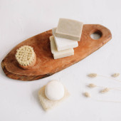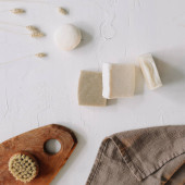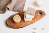 Zero odpadów akcesoria kuchenne, naturalne mydło organiczne. Koncepcja produktów wolnych od tworzyw sztucznych i przyjaznych dla środowiska w gospodarstwach domowych, widok z góry