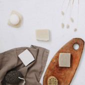 Zero odpadów akcesoria kuchenne, naturalne mydło organiczne. Koncepcja produktów wolnych od tworzyw sztucznych i przyjaznych dla środowiska w gospodarstwach domowych, widok z góry