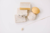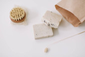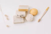 Zero odpadów akcesoria kuchenne, naturalne mydło organiczne. Koncepcja produktów wolnych od tworzyw sztucznych i przyjaznych dla środowiska w gospodarstwach domowych, widok z góry