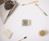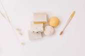 Zero odpadów akcesoria kuchenne, naturalne mydło organiczne. Koncepcja produktów wolnych od tworzyw sztucznych i przyjaznych dla środowiska w gospodarstwach domowych, widok z góry