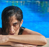 Piękny model pozujący pod wodą w krystalicznie czystym basenie