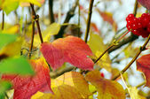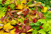Na stole są żółte liście z drzewa orzecha włoskiego, wiśni i owoców viburnum.