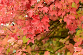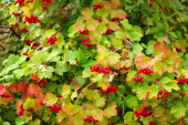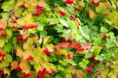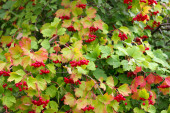 Na stole są żółte liście z drzewa orzecha włoskiego, wiśni i owoców viburnum.