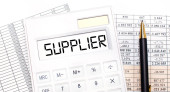 DOSTAWCA to słowo stojące za podartym papierem biurowym z numerami i czarnym długopisem. Koncepcja biznesowa i finansowa