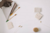 Zero odpadów akcesoria kuchenne, naturalne mydło organiczne. Koncepcja produktów wolnych od tworzyw sztucznych i przyjaznych dla środowiska w gospodarstwach domowych, widok z góry