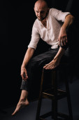 Modelowe testy dla mężczyzn. Dorosły mężczyzna w niebieskiej koszuli, pewnie patrzy w kamerę i stoi za niebieskim krzesłem. Niewielka fotografia. Wzmocnienie zaufania i władzy.