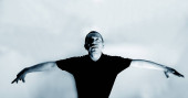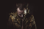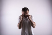 Modelowe testy męskie. Emocje zaskoczenia i radości. Dorosły mężczyzna tańczący na szarym tle. Stylowa fotografia mody. Człowiek w okularach słonecznych