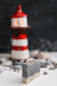 Mydło z muszelkami i kamieniami na białym tle. Spa lub wellness ustawienie. minimalna koncepcja. makieta z widokiem z góry