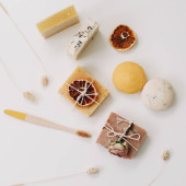 Zero odpadów akcesoria kuchenne, naturalne mydło organiczne. Koncepcja produktów wolnych od tworzyw sztucznych i przyjaznych dla środowiska w gospodarstwach domowych, widok z góry