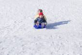 cute dziewczynka ściąga sanki w zimie ciepły dzień
