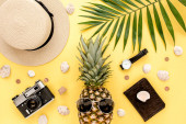 Damskie akcesoria plażowe: torba rattanowa, słomkowy kapelusz, tropikalne liście palmowe, model płaszczyzny, samolot na żółtym tle. Koncepcja podróży. Lato