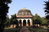 Pomnik przy grobowcu Humayuna z boku trawnika w zimowy mglisty poranek.