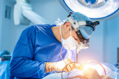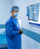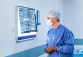 Lekarz bada rezonans magnetyczny ludzkiej głowy w szpitalu. Podświetlana tablica z filmem rentgenowskim. Lekarz w fartuchu.
