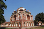 Pomnik przy grobowcu Humayuna z boku trawnika w zimowy mglisty poranek.