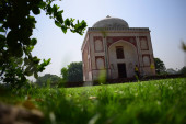 Gałąź drzewa stwarzają jakiś dramatyczny widok pomnika przy grobowcu humayun pomnik od strony trawnika w zimowy mglisty poranek.