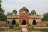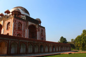 Pomnik przy grobowcu Humayuna z boku trawnika w zimowy mglisty poranek.