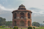 Grób sikandar lodhi pomnik na lodi ogród albo lodhi ogrody w miejskim parku od boku trawnika w zimowym mglistym poranku.