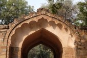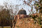 Grób sikandar lodhi pomnik na lodi ogród albo lodhi ogrody w miejskim parku od boku trawnika w zimowym mglistym poranku.