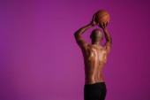 Obraz wysportowanego pół nagiego Afrykanina grającego w koszykówkę, odizolowanego nad fioletową ścianą.