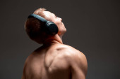 Widok z boku zdjęcie afrykańskiego skoncentrowanego człowieka pozującego na neonowym tle ściany podczas słuchania muzyki ze słuchawkami