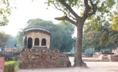 Gałęzie drzewa tworzą jakiś dramatyczny widok pomnika w hauz khas pomnik od strony trawnika w zimowy mglisty poranek.