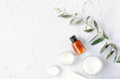 Butelka olejku eukaliptusowego, liście eukaliptusa na białym tle. Naturalne kosmetyki ekologiczne. Płaskie ułożenie, widok z góry.