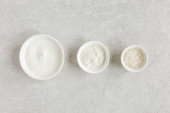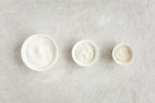 Trzy różne naturalne kosmetyki spa w misce: krem do twarzy, glina kosmetyczna, sól morska na szarym tle marmuru. Koncepcja pielęgnacji skóry.