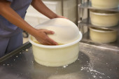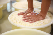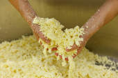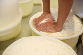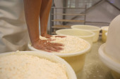 Robotnik wciskający twarożek do formy w fabryce sera, zbliżenie