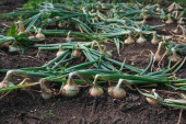 Zielona cebula rośnie na polu, zbliżenie. Okres zbiorów
